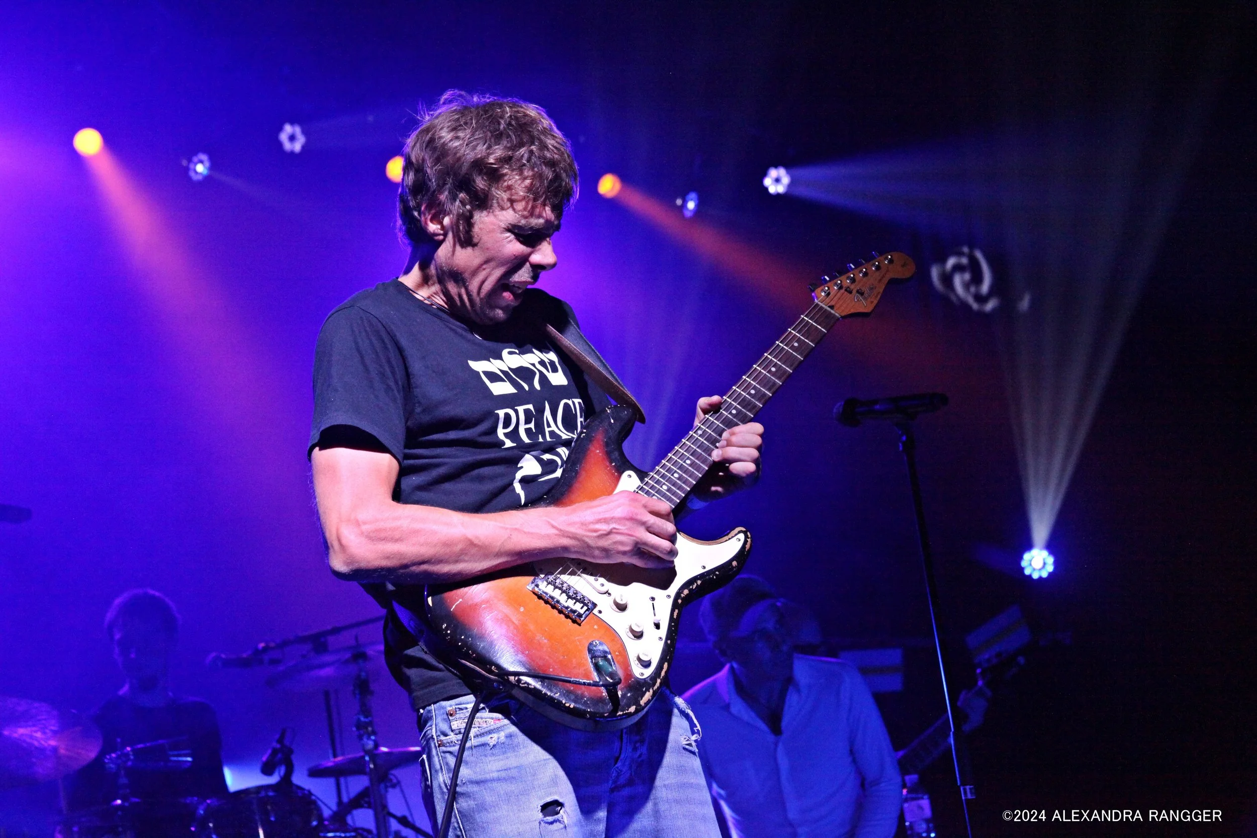 Ein Musiker spielt E-Gitarre auf der Bühne in einem Konzert mit Lichtshow, während ein anderer Musiker im Hintergrund Schlagzeug spielt.